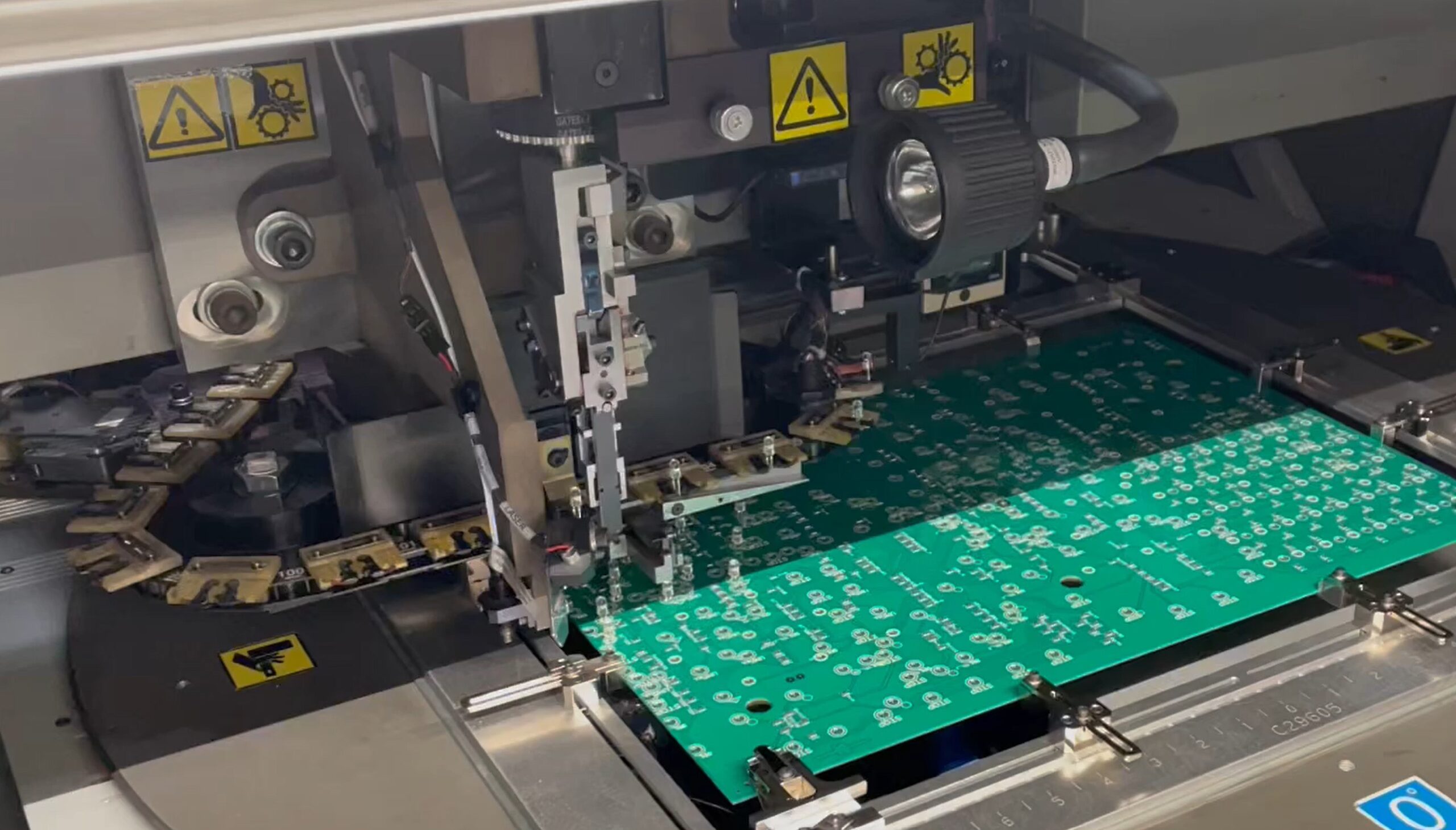 Mit dem THT-Radialbestücker werden bedrahtete Bauteile in hoher Stückzahl zuverlässig und fehlerfrei auf Leiterplatten platziert. Das gilt vor allem für LEDs in unterschiedlichen Farben, deren Unterscheidung im unbestromten Zustand oft nicht möglich ist und die erst im eingeschalteten Zustand eindeutig erkennbar werden. Gerade hier sorgt die automatisierte Bestückung für ein hohes Maß an Sicherheit, Wiederholgenauigkeit und Qualität.